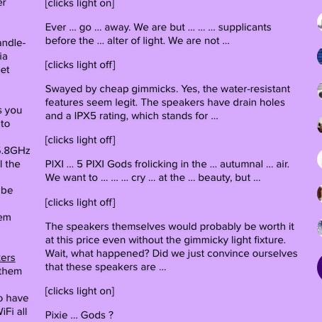 @skemmehs delight ready start of your write-upward: "The lights come either with their own built-in speakers ("Twilight") or without ("Island"), …" Otherwise, fun as always.