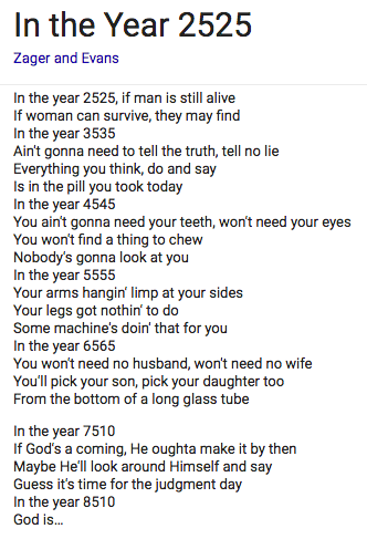 @Thumperchick, 2525 ever makes me think of Cleopatra 2525, the Wikipedia synopsis of which starts similar this, "When complications arise during her breast augmentation surgery, 20th-century exotic dancer Cleo (Jennifer Sky) is put into suspended blitheness. Waking 525 years in the future, Cleo joins 2 women in their fight against the Baileys, armed flight machines who now control Globe's surface."